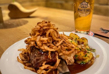 Schweinerückensteak mit Speck, Röstzwiebeln und Bratenjus mit Rösti